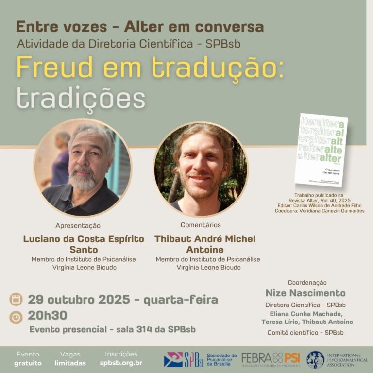 Sociedade Brasileira de Psicanálise do Rio de Janeiro (SBPRJ);Sociedade Psicanalítica do Rio de Janeiro (SPRJ);Associação Psicanalítica do Estado do Rio de Janeiro (APERJ-Rio4). A Sociedade de Psicanálise de Brasília – SPBsb expressa sua mais profunda