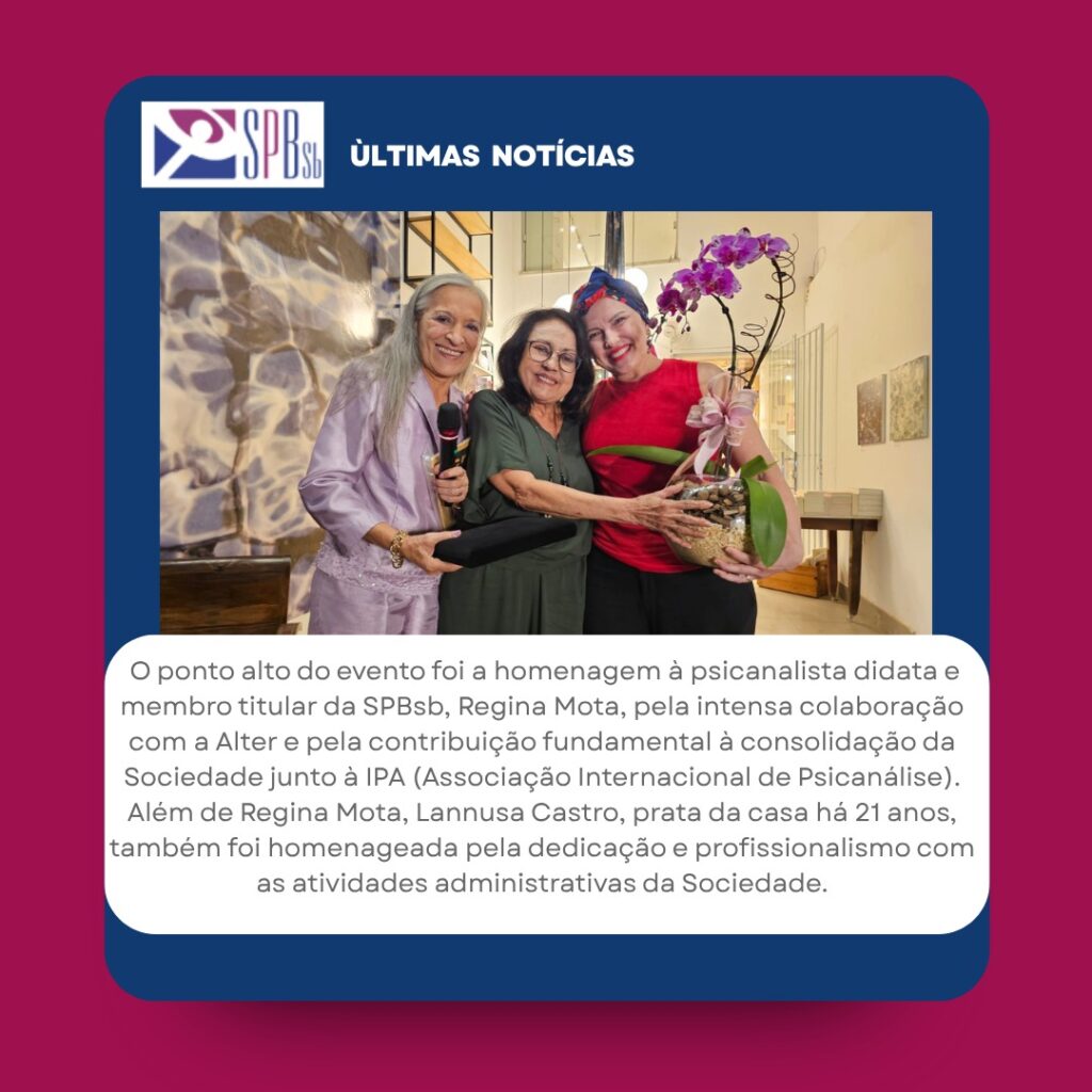 O ponto alto do evento foi a homenagem à psicanalista didata e membro titular da SPBsb, Regina Mota, pela intensa colaboração com a Alter e pela contribuição fundamental à consolidação da Sociedade junto à IPA (Associação Internacional de Psicanálise). Além de Regina Mota, Lannusa Castro, prata da casa há 21 anos, também foi homenageada pela dedicação e profissionalismo com as atividades administrativas da Sociedade.