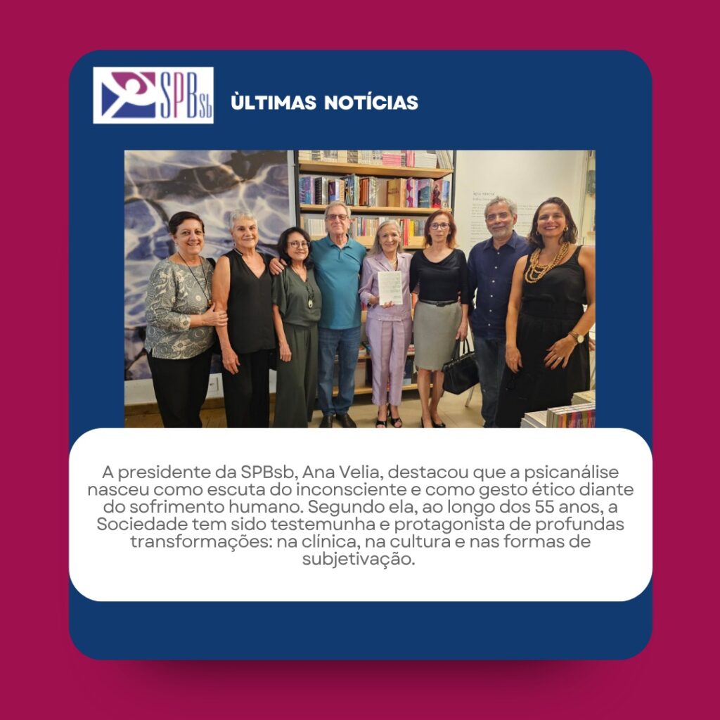 A presidente da SPBsb, Ana Velia, destacou que a psicanálise nasceu como escuta do inconsciente e como gesto ético diante do sofrimento humano. Segundo ela, ao longo dos 55 anos, a Sociedade tem sido testemunha e protagonista de profundas transformações: na clínica, na cultura e nas formas de subjetivação.